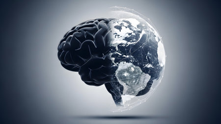 A dark human brain merges with a glowing earth, overlaid by a digital network grid....