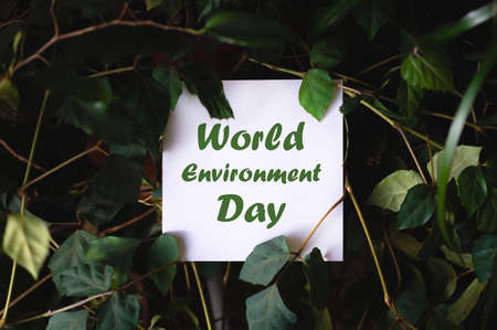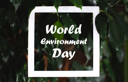 Square papper with world environment day text on green plant leaves background. Concept card on the theme of nature and flora