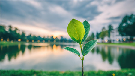 A close-up captures a young plant with bright green leaves, set against a blurred background of a tranquil lake and sky. The composition features a natural, soft aesthetic, with diffused lighting and a focus on color contrast. Suitable for environmental themes, it can be used for various projects.