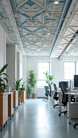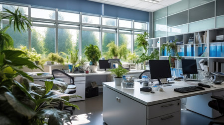Modern open office with white desks and potted plants. That the image is generated using AI.