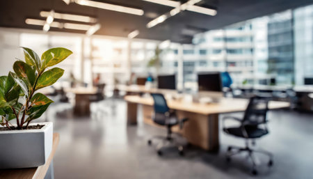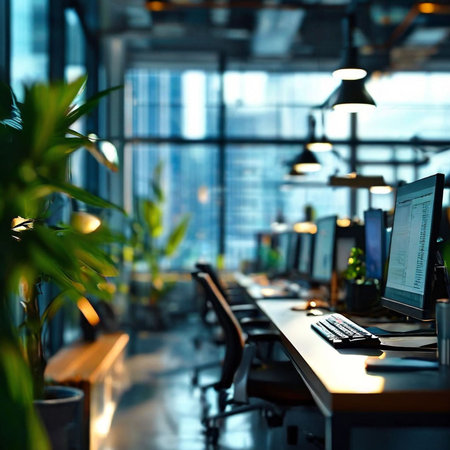 Modern office interior with computers and plants on the foreground. Blurred background.