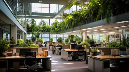 A Spacious and modern ecofriendly office interior flooded with natural light and green plants, promoting a healthy work environment