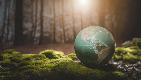 A globe depicting the continents and oceans sits on a bed of vibrant green moss in a dense forest, showing the harmony between nature and geography.