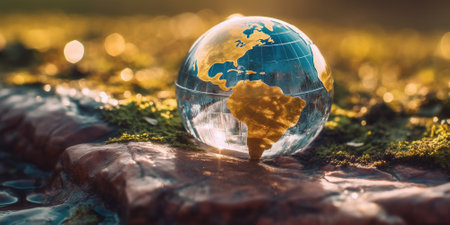 Crystal globe rests on vibrant green moss, symbolizing Earth. globe showcases continents and oceans, reflecting serene and natural environment. This evokes sense of harmony with nature