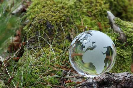 In a forest, a globe rests on moss - Europe and Africa - a concept for an environment
