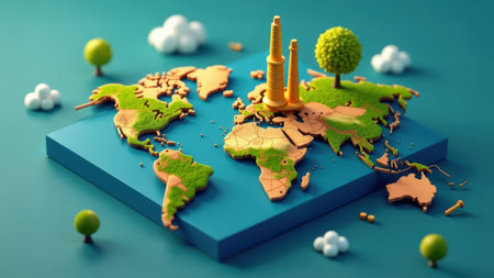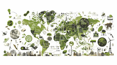 Illustration of a world map integrated with symbols representing environmental conservation, energy technologies, and global sustainability efforts, emphasizing renewable energy and ecological balance.