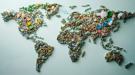 A world map created from scattered plastic waste, illustrating the global impact of pollution and the need for recycling efforts.