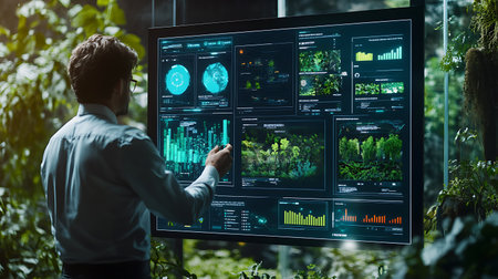 An image showcases a digital interface panel with data visualizations alongside vibrant green foliage. The scene features bright lighting, suggesting an indoor environment. This composition might be useful for illustrating concepts related to technology, nature, or environmental sustainability. It is suitable for various commercial or editorial applications.