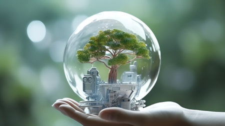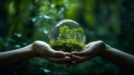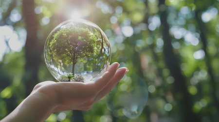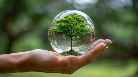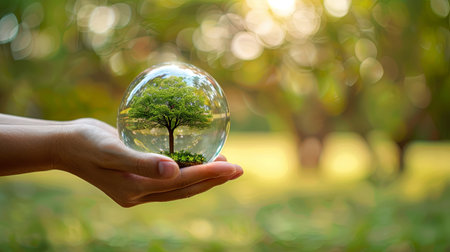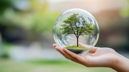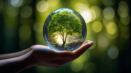 A hand cradles a transparent glass globe containing a small tree, set against a blurred green backdrop. The image features natural light and a shallow depth of field, highlighting the globe and tree's details. This conceptual composition could be used for illustrations related to sustainability or environmental themes.