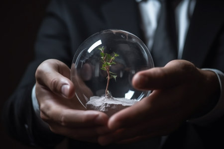 man in a suit holding a transparent sphere with a sprout inside in his hands. AI generated content