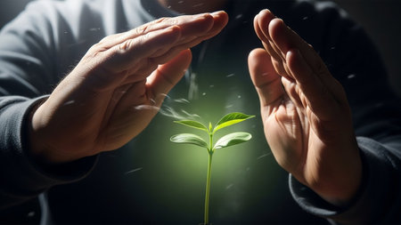 The image depicts a pair of hands gently cradling a small, glowing plant. The hands are positioned in a way that suggests protection and care, with the plant emitting a soft, radiant light. The background is dark, emphasizing the plant and the hands, which are illuminated by the plant's glow. This image conveys themes of nurturing, growth, and protection.