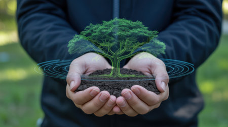 Hands holding soil with a glowing digital tree and circular data streams