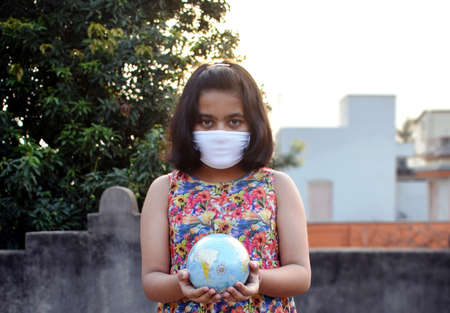 Surgical mask on Earth globe. Epidemics concept. World infected with Covid-19 / Coronavirus.