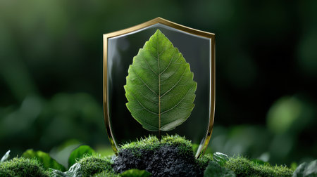 A tree is inside a glass case that is shaped like a shield. The shield is surrounded by green leaves and branches, creating a sense of protection and safety for the tree
