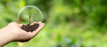 Green tree held in humna hand growing inside crystal glass planet with bright summer forest background concept of growth and ecology.