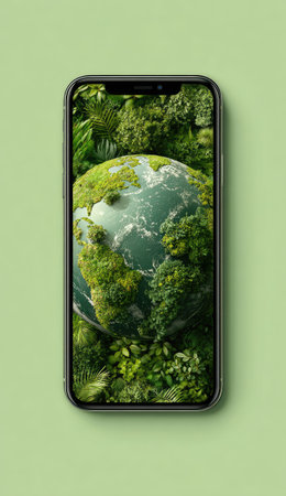 An illustration features a smartphone showcasing a detailed image of Earth covered in dense green foliage. The artwork emphasizes a sense of environmental awareness and the integration of technology with nature. The overall aesthetic is clean and modern, against a muted green background. Suitable for digital advertising and ecological themes.