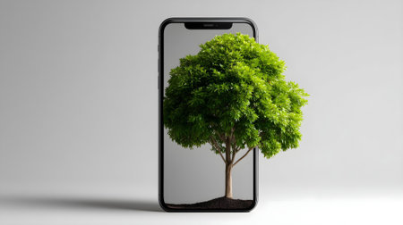 Smartphone with green tree on the screen isolated on gray background.ai generated