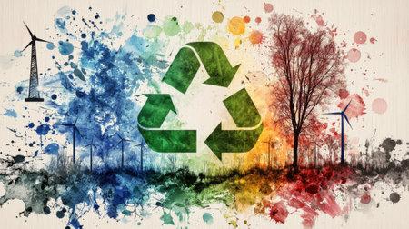 A striking graphic design featuring a recycle symbol surrounded by lush trees and a serene water landscape, embodying ecological awareness and harmony.