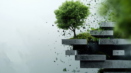 Rough grey concrete blocks form an ascending staircase, adorned with vibrant green moss and a small tree, surrounded by scattering fragments.