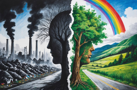 Two roads, two faces, two futures: the left side shows a bleak world filled with smoke, trash, and lifeless trees – a reflection of pollution and unconscious human impact. The right side reveals a lush, green landscape with a face-shaped tree and a rainbow, symbolizing awareness, hope, and the power of sustainable choices.