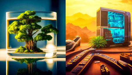 Two pictures one with tree in glass and the other with computer. Technology and Nature. futuristic tools as an aid to life. Generative AI.