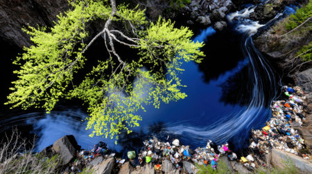 A striking depiction of pollution featuring plastic bottles and other waste amidst vibrant greenery, highlighting the importance of environmental care and awareness.