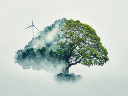 A vibrant evergreen rises through swirling fog, with a sleek turbine gently spinning behind, illustrating the peaceful coexistence of natural beauty and sustainable innovation