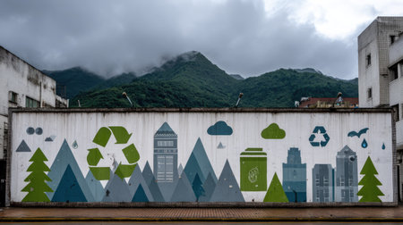 This captivating mural showcases a harmonious blend of nature and urban life, emphasizing recycling and sustainability against a backdrop of mountains and trees.