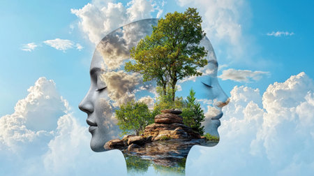 This captivating artwork features human silhouettes merged with nature elements like trees and clouds, symbolizing the connection between mind and environment.
