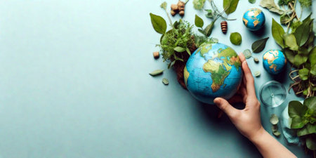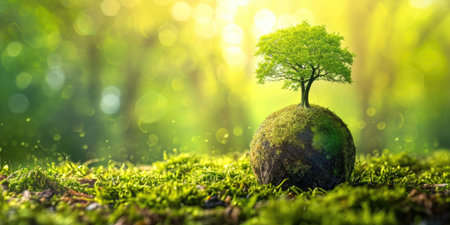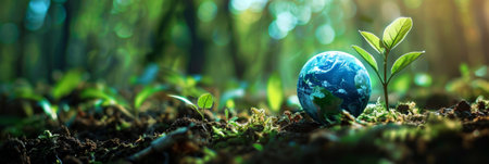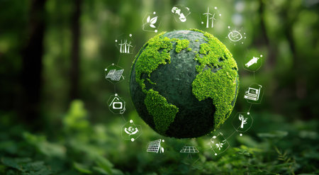 An image showcases a lush green earth globe surrounded by environmental icons, set against a blurred forest backdrop. The composition uses soft focus and natural lighting to emphasize eco-consciousness and sustainability. The scene is likely intended for use in environmental campaigns, educational materials, and sustainable business promotions.