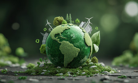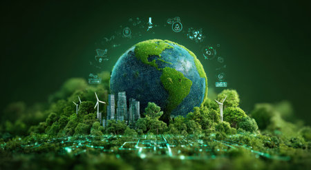 An image showcases a globe with lush green vegetation, symbolizing Earth. Surrounding the globe are miniature wind turbines and city structures, while digital icons float above. The composition is vibrant with varying shades of green, illuminated with soft lighting. This artwork suits various projects related to ecology and conservation.
