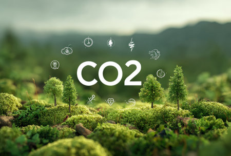 A visual representation features the CO2 symbol set against a backdrop of a natural landscape, surrounded by graphic icons. The composition utilizes vibrant green and earthy tones to evoke a sense of the outdoors. This image is suitable for various commercial uses related to environmental topics.