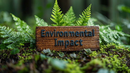Close-up of a wooden sign with 'Environmental Impact' text surrounded by vibrant green ferns and moss, highlighting the concept of nature conservation and sustainability.