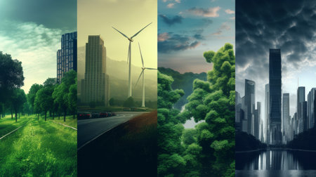 Four different images of cities and nature, with one showing a city with a windmill and another showing a city with a windmill and a forest. The other two images show cities with a forest and a river