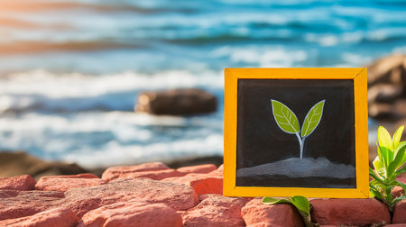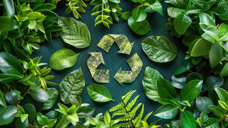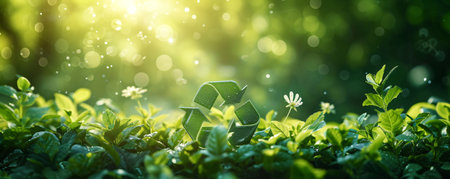 An eco-friendly concept with lush green leaves, a recycling symbol, and a hand gently holding a small plant, symbolizing growth and sustainability.