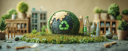 Eco-themed 3D artwork featuring a grassy Earth and sustainable objects