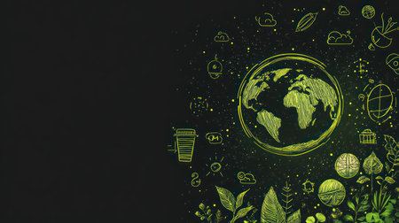 An eco friendly concept with glowing green earth and environmental icons on black background, inspiring sustainable living and nature care