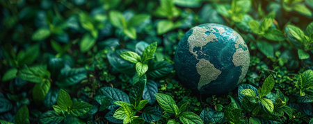 A vibrant earth globe rests among lush green leaves, symbolizing nature's beauty and the importance of environmental conservation in a thriving ecosystem.