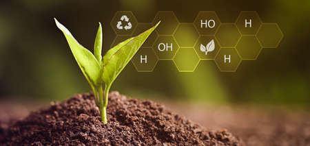 Illustration of chemical formula and young seedling growing in soil outdoors, closeup. banner design