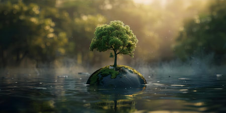 Blooming tree on Earth globe, reflecting in water; environmental conservation image