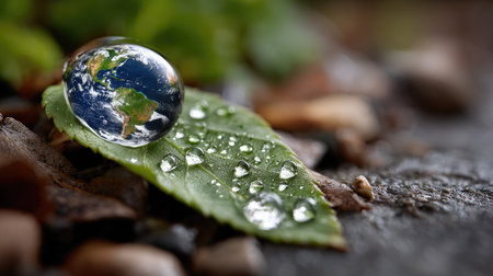 Close-up view of a green leaf adorned with clear water droplets, featuring a globe reflection, emphasizing the beauty and fragility of nature's ecosystem.