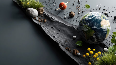 A striking artistic composition showcasing a globe surrounded by natural elements like grass and stones, complemented by cosmic themes and textures.