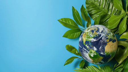 A captivating image of the Earth globe surrounded by vibrant green leaves, set against a striking blue background. Perfect for themes of nature, sustainability, and global awareness.