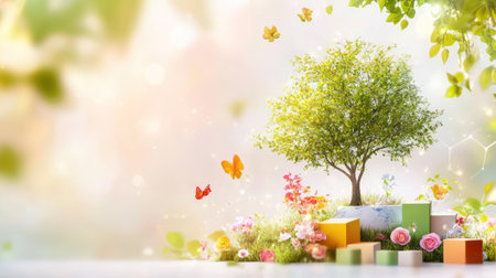 This enchanting nature scene features a vibrant tree surrounded by colorful butterflies and blossoms, evoking feelings of spring and tranquility.