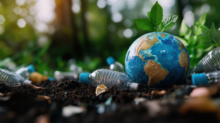 A model Earth surrounded by discarded plastic bottles and bags, symbolizing global plastic pollution