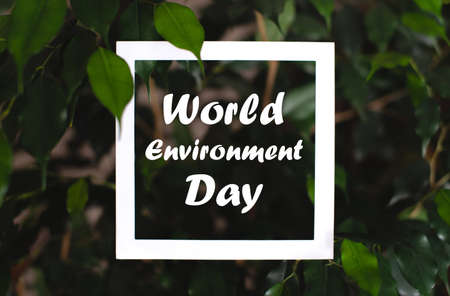 Square frame with world environment day text on green plant leaves background. Concept card on the theme of nature and flora