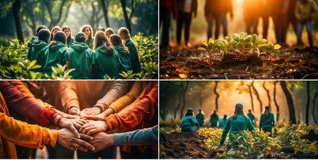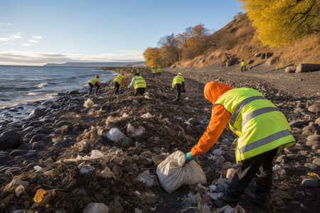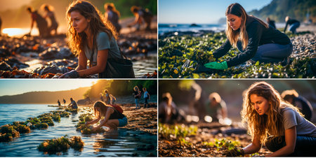 Environmental volunteers work together to clean up beaches and protect the planet. Fight ocean pollution and promote environmental protection. Dedicated activists