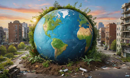 Powerful image showing planet Earth perched atop a pile of plastic waste emphasizing the contrast between the beautiful Earth and the surrounding pollution