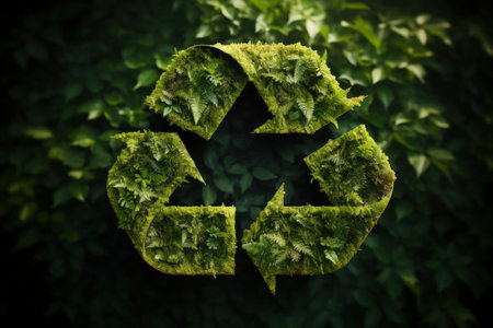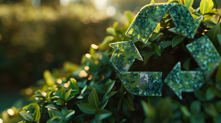A vibrant green recycling symbol intertwined with fresh leaves, symbolizing the harmony between recycling and nature. Perfect for promoting eco-friendly practices. Space for text. -