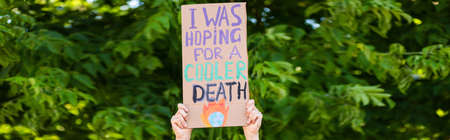 Panoramic orientation of man holding placard with i was hoping for a cooler death lettering with trees at background, ecology concept